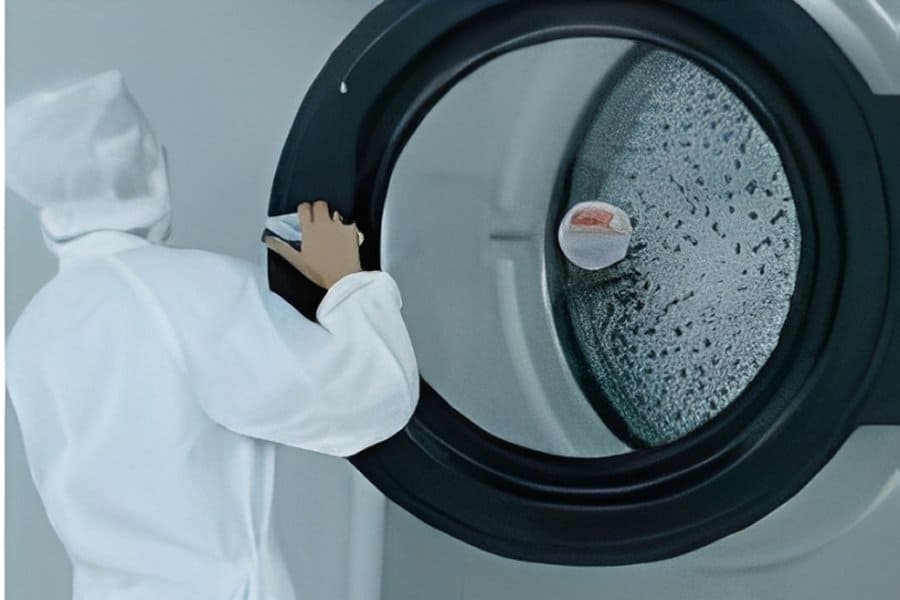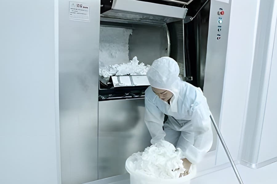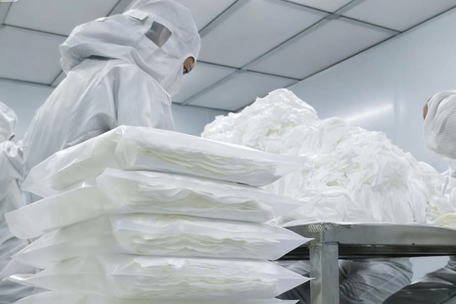 Washed materials are dried in filtered cleanroom conditions to limit airborne particles and prepare the wipes for sealing and packaging.