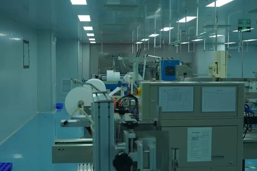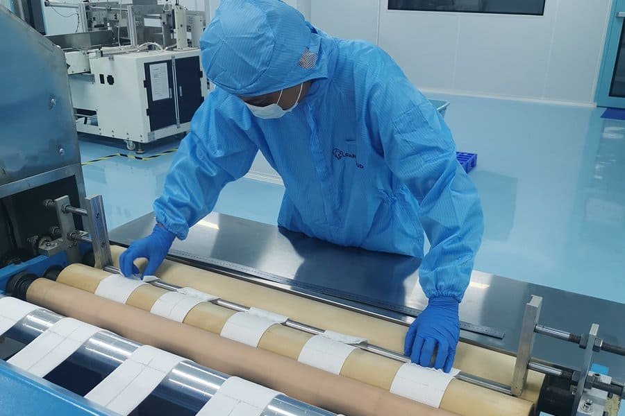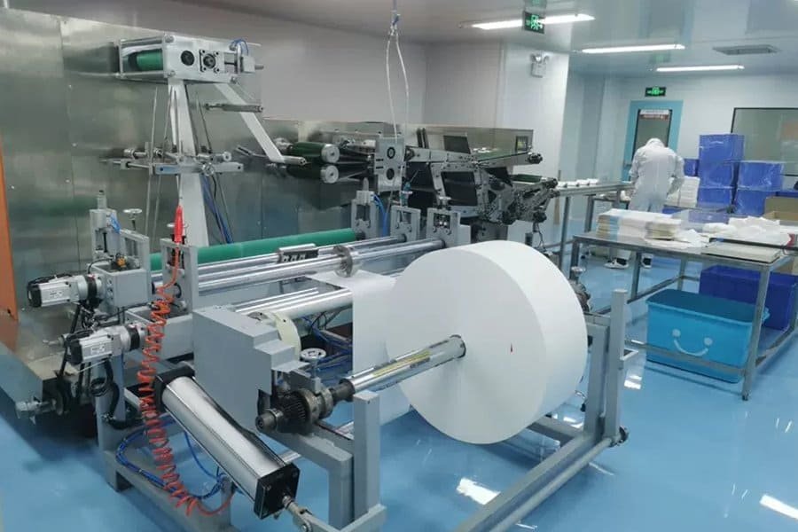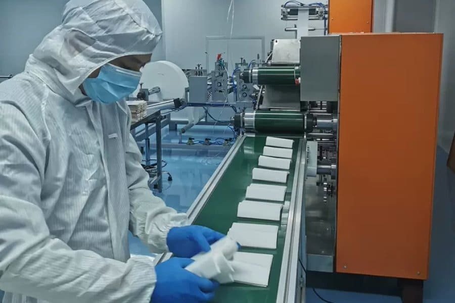 Washed materials are dried in filtered cleanroom conditions to limit airborne particles and prepare the wipes for sealing and packaging.