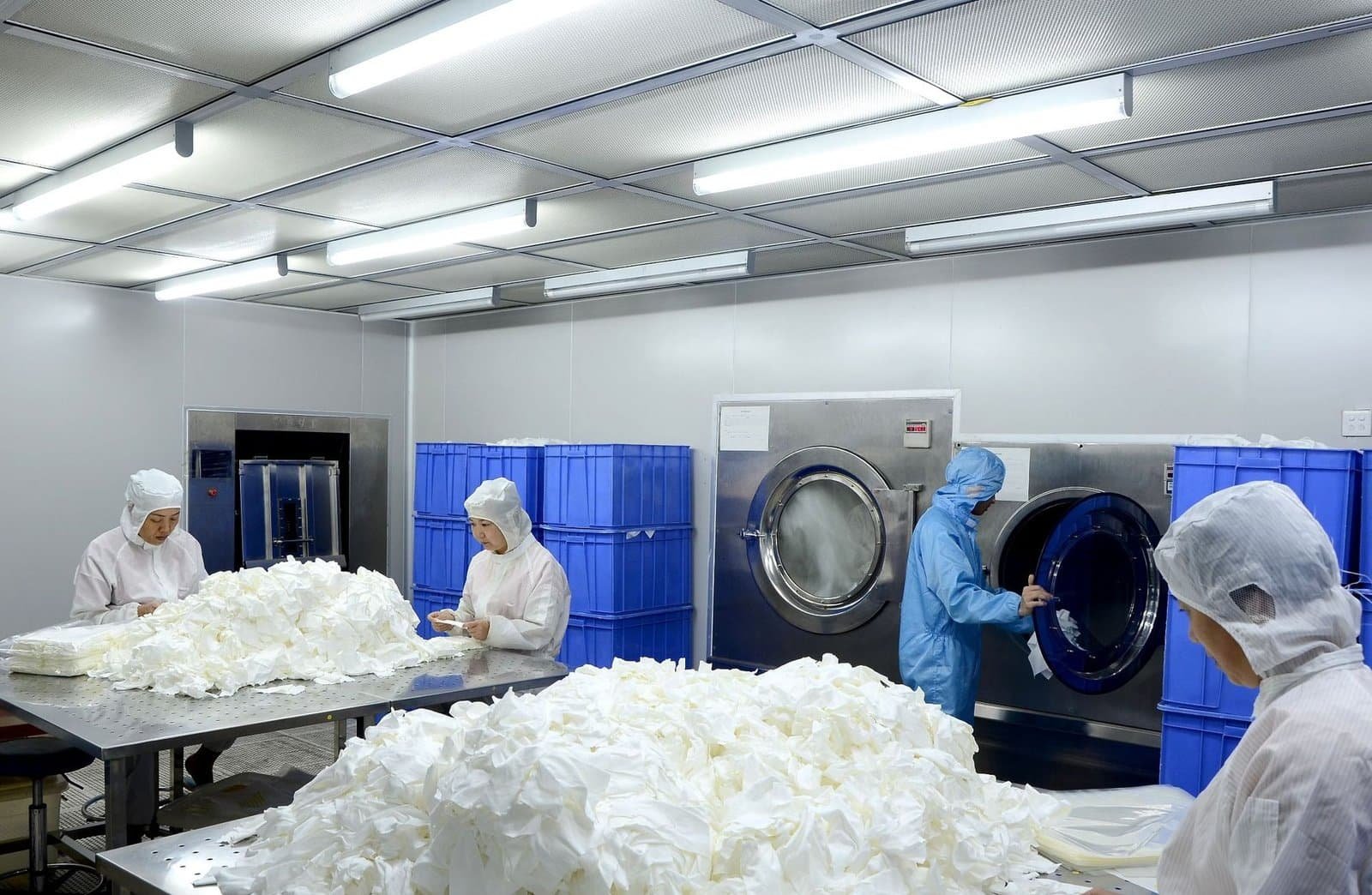 Washed materials are dried in filtered cleanroom conditions to limit airborne particles and prepare the wipes for sealing and packaging.
